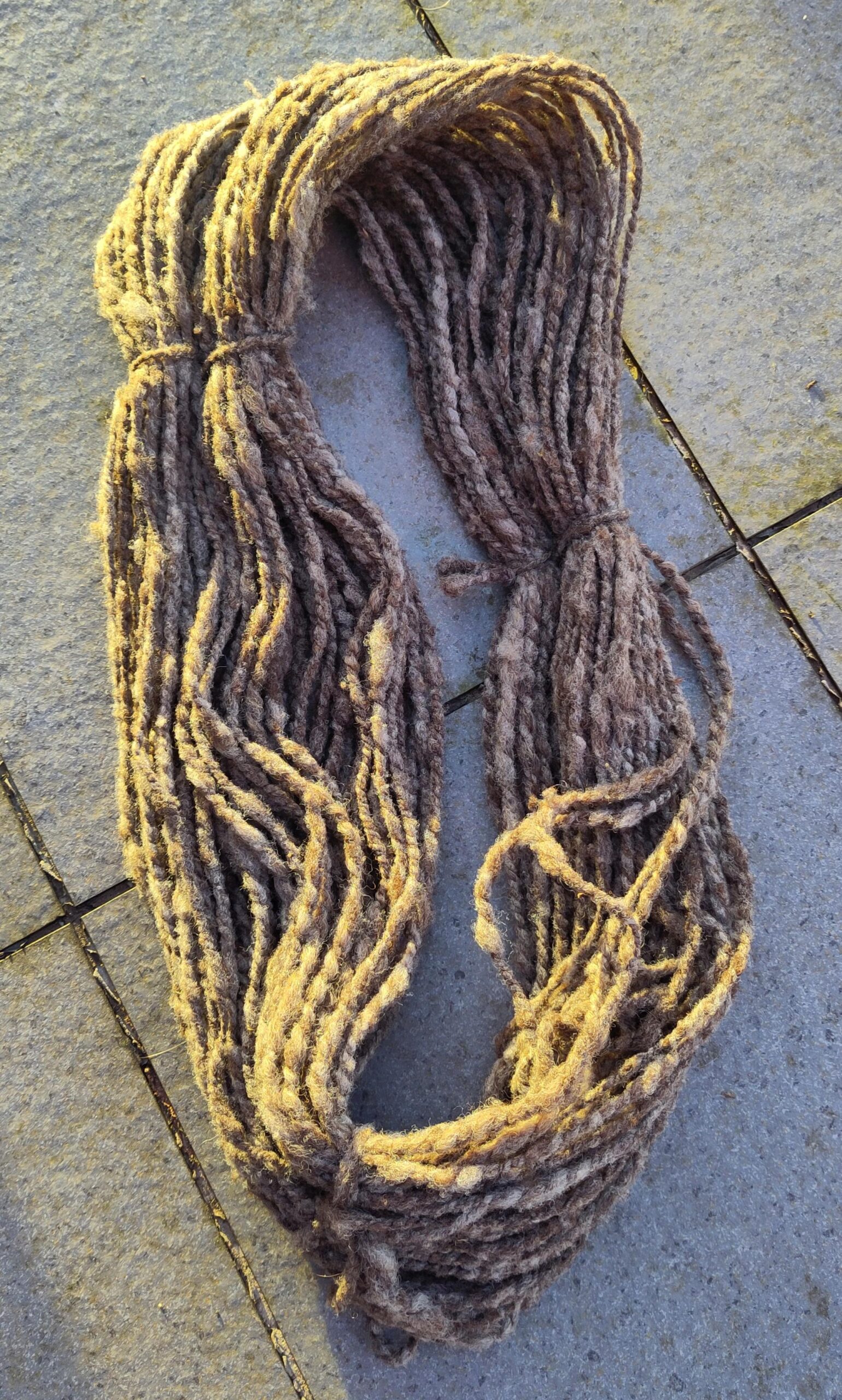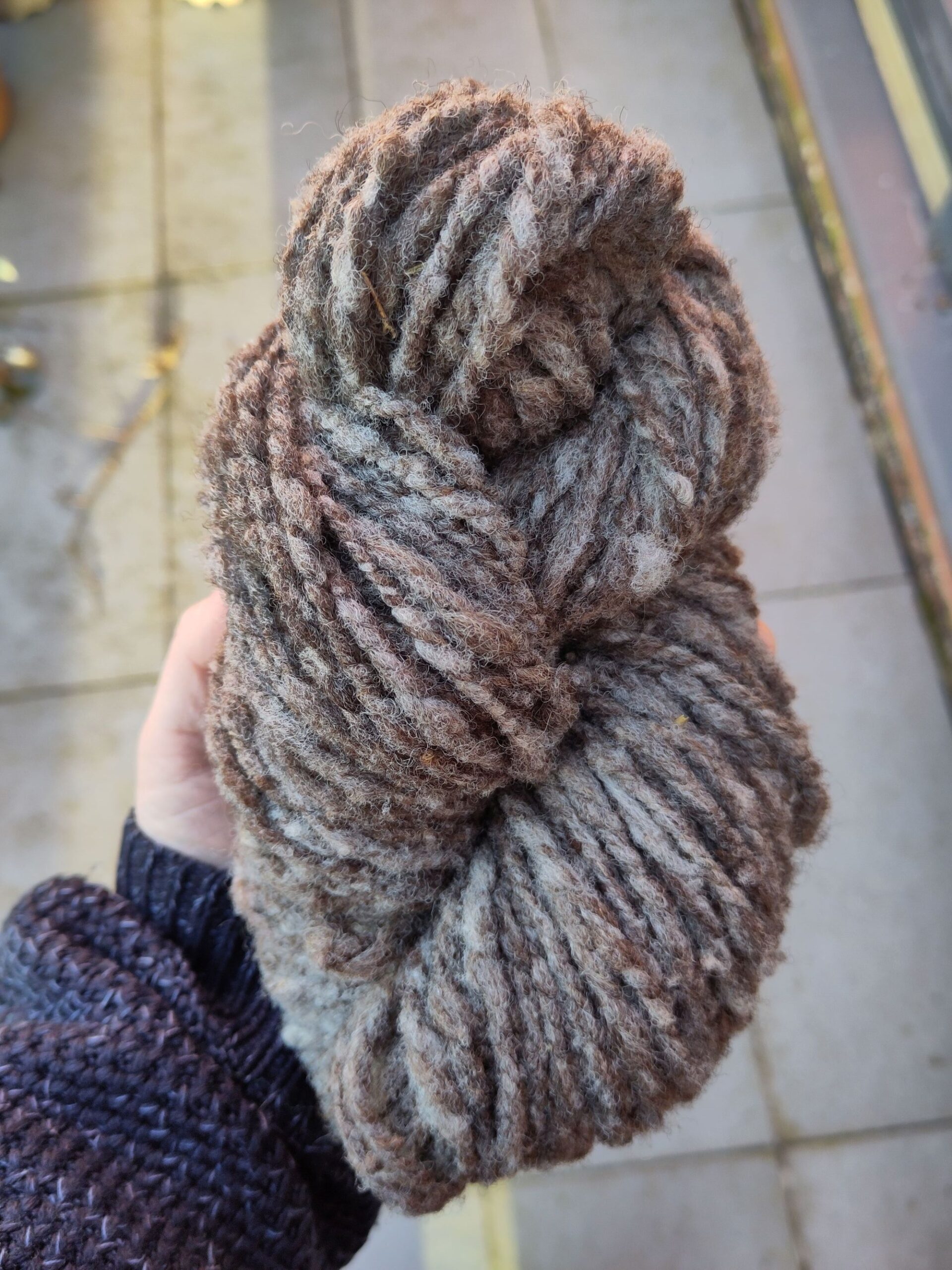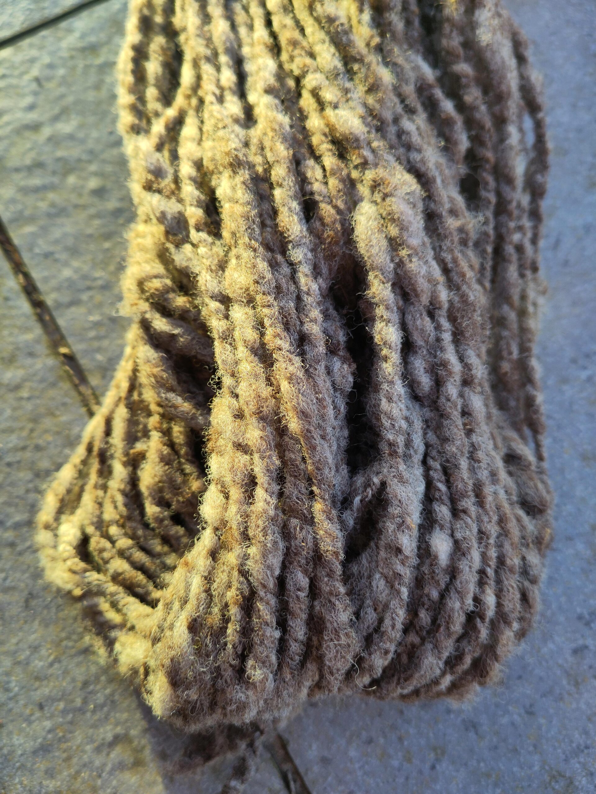 this fibre is sourced from a local farm just 20 miles from cardiff, near cowbridge. after collecting, it’s washed in small batches of around 400g and carded with my hand carders. it then gets spun into two singles of about 50g each, before being plied together. the yarn is then finished by soaking it in water and hanging it to dry attached to a small weight to help set the spin.